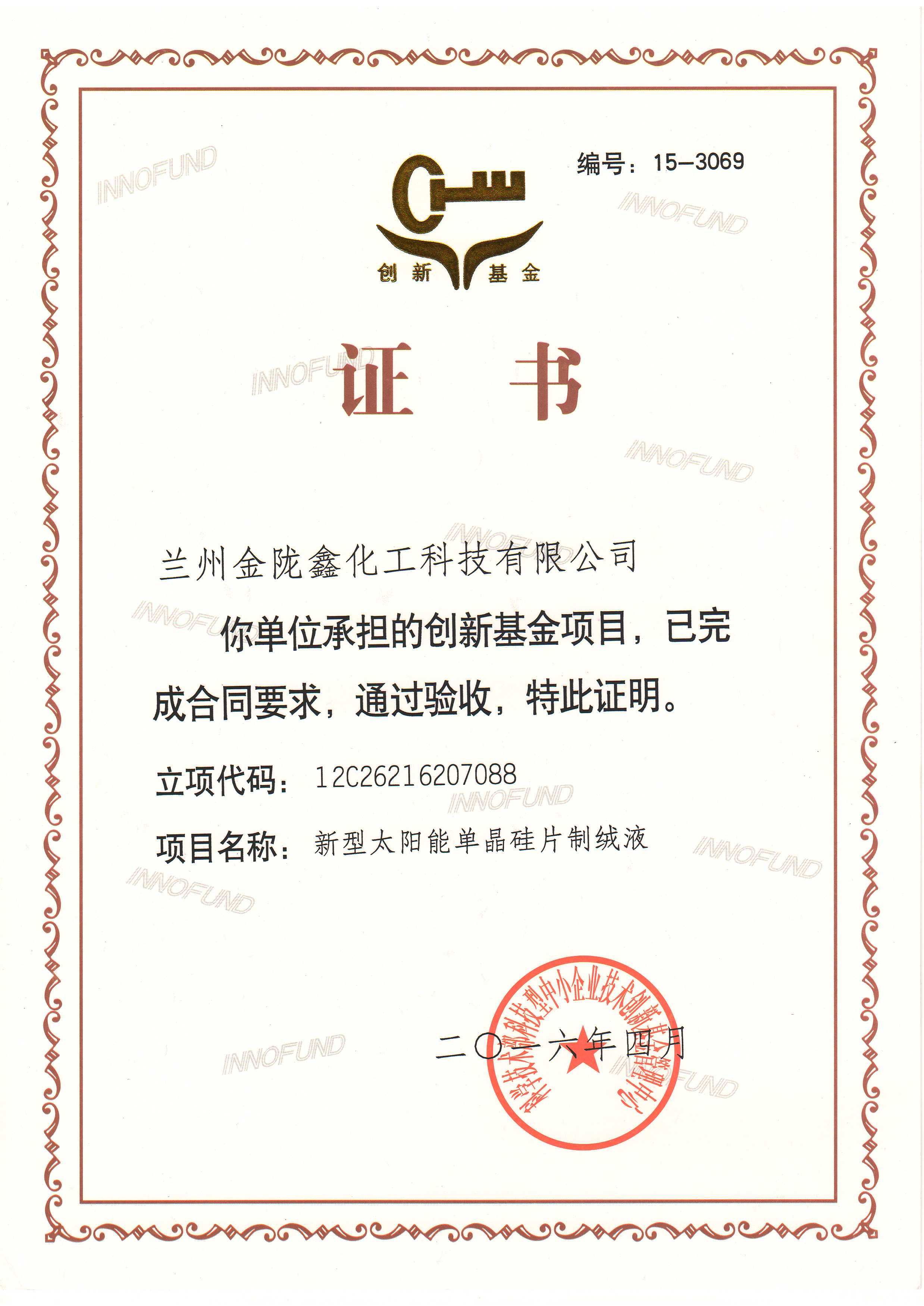 恭喜!我公司承擔(dān)的科技部項(xiàng)目《新型太陽能單晶硅片制絨液》通過驗(yàn)收并拿到了驗(yàn)收合格證書。