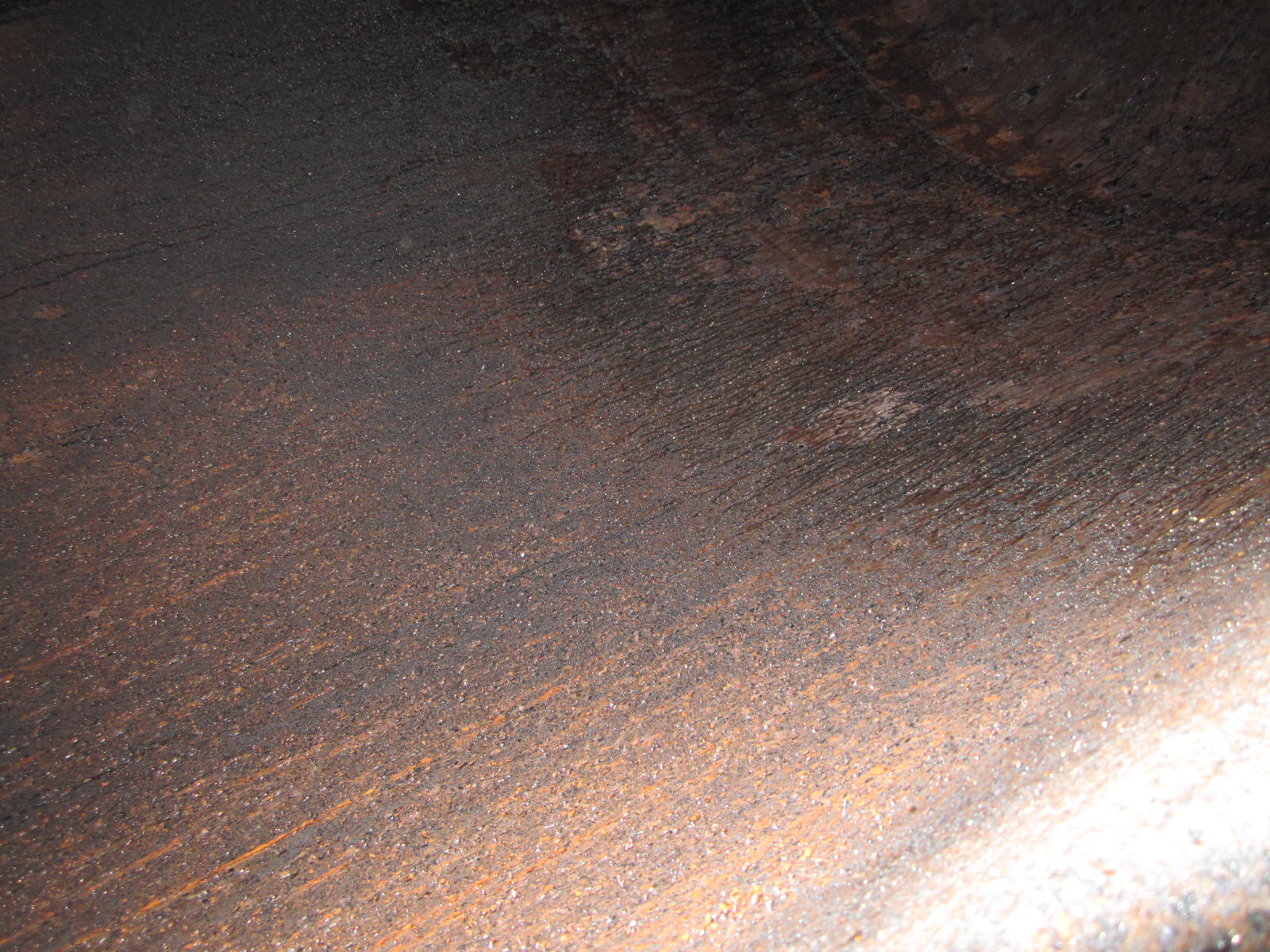 2011年10月19號打開了T-201、T-202、T-301、T-302、T-303的人孔,經(jīng)過實地勘察和拍照取證我們發(fā)現(xiàn)設(shè)備的腐蝕情況較為嚴重。T-301、T-302、T-303整體腐蝕都非常嚴重,內(nèi)表層全部覆蓋滿銹跡,有些地方鐵銹層能達到2毫米左右。T-201塔底腐蝕不是很厲害銹跡較少,中部開始腐蝕銹跡慢慢變多,越往塔上部腐蝕越嚴重鐵銹層也越厚,最厚處銹層也能達到2毫米左右。T-202腐蝕也很嚴重能看見大片的銹跡不過銹層不是很厚。