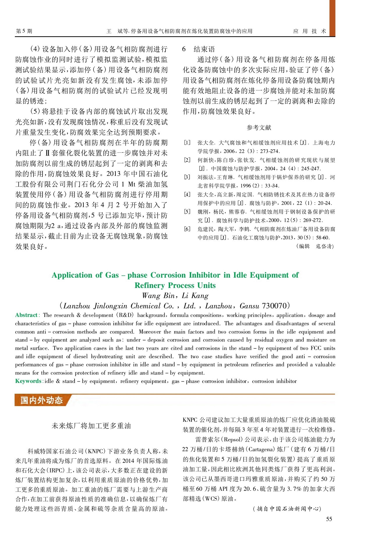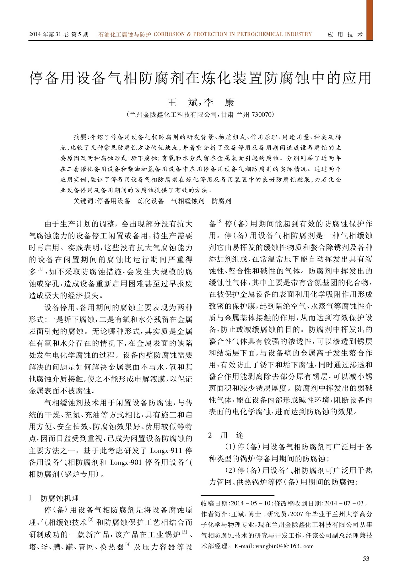 《停備用設備氣相防腐劑在煉化裝置防腐蝕中的應用》文章正式出版